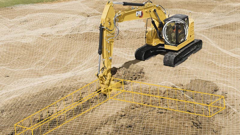 Mit deinem Bagger profitierst du u. a. von Cat Grade: Auf 2 cm genau wird dir die Position der Löffelschneide in der Kabine angezeigt. Zudem: Wägesystem Payload, Arbeitsraumbeschränkung e-Fence.