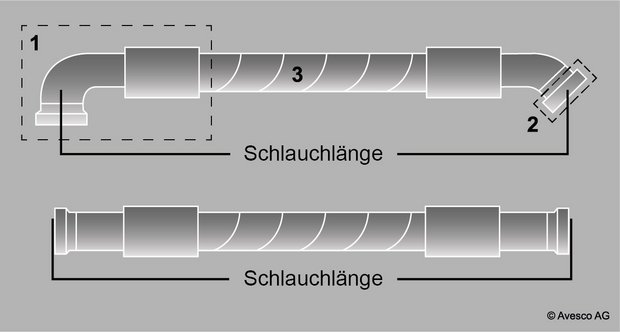 (1) Pressarmatur, (2) Dichtfläche, (3) Schlauch. Bei Hydraulikschläuchen wird die Schlauchlänge in der Regel von Dichtfläche zu Dichtfläche an beiden Enden des Schlauches gemessen. Bei gekrümmten Pressarmaturen wird in der Mitte der Dichtfläche gemessen.