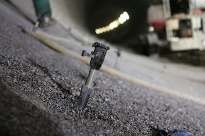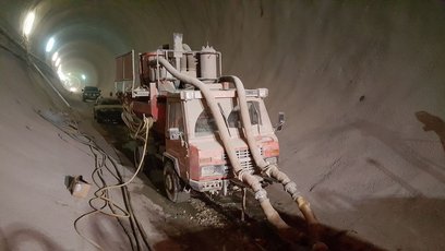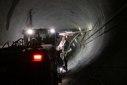 Une composition, formée d’un jumbo de forage et d’un transporteur avec agrégat d’aspiration, effectuait les travaux de forage dans le tunnel.