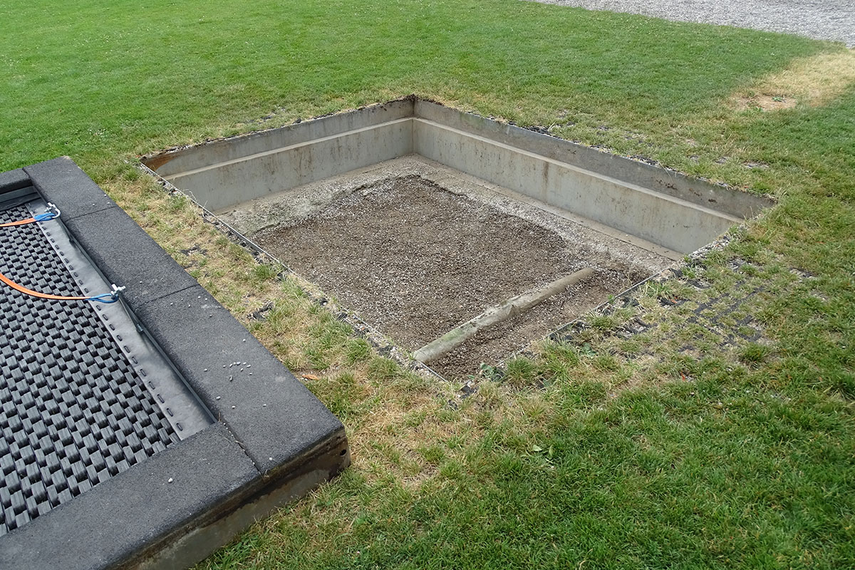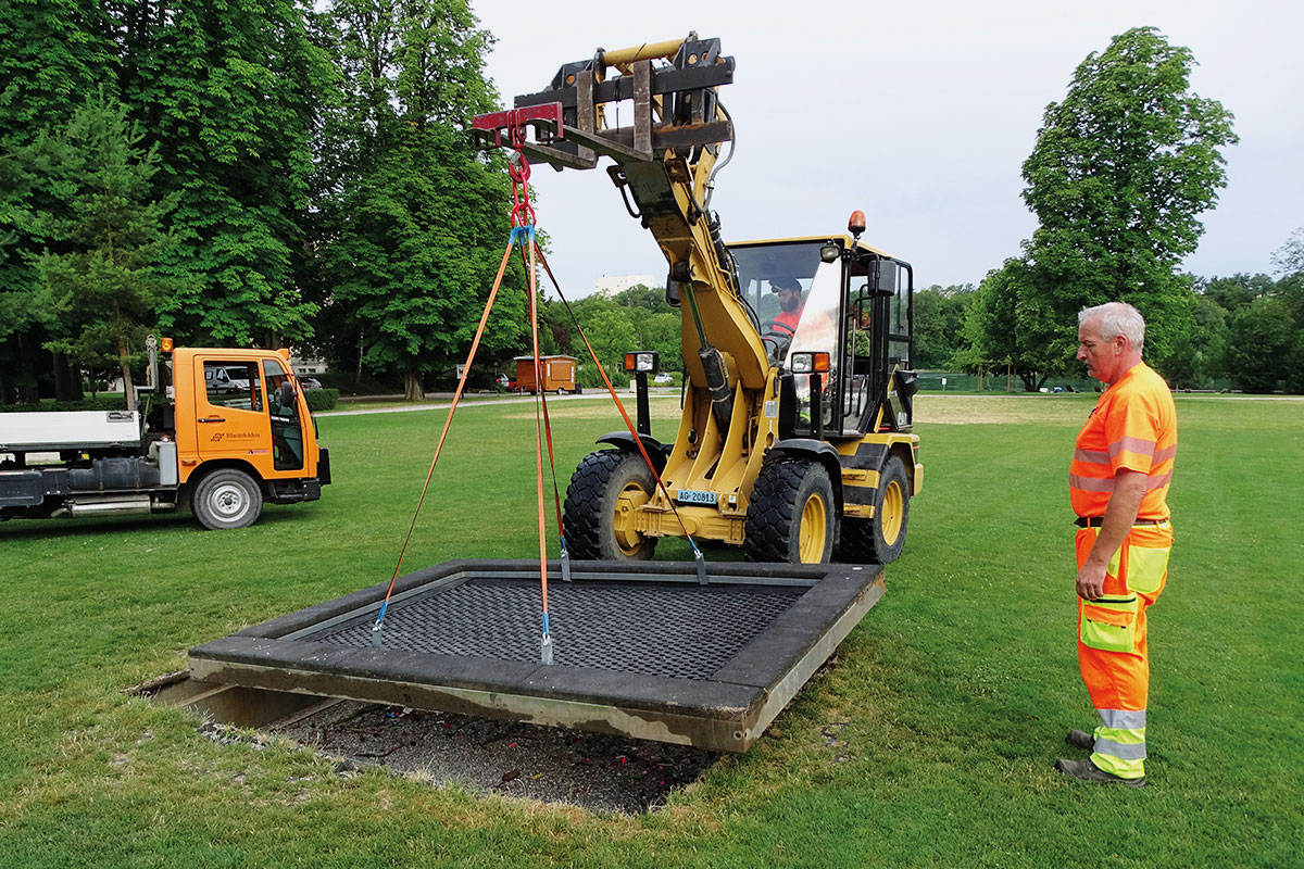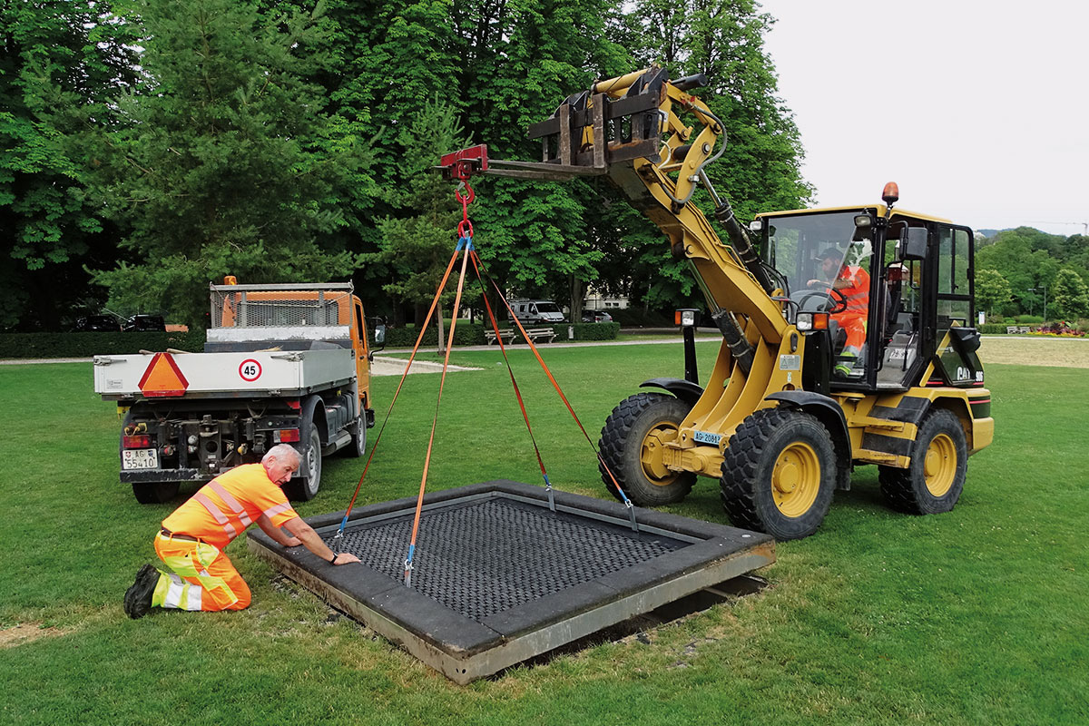 A présent, c’est parti, la chargeuse sur pneus est positionnée à côté du trampoline et les quatre câbles-tendeurs sont montés selon les règles de l’art au bord de celui-ci. Lentement, Hofmann tire la fourche vers le haut et soulève le cadre d’un poids de 350 kg avec le filet en caoutchouc de la fosse. Une couche de gravier et de déchets, qui s’est accumulée durant l’année, apparaît alors. Les deux hommes empoignent leurs pelles et commencent à déblayer le sol de la fosse. Ils retirent ainsi plus d’un quart de mètres cube de matières qu’ils chargent dans les boxes prévus à cet effet. Après cet acte de force, ils examinent avec satisfaction la fosse vide et prennent le temps de répondre brièvement à quelques questions.
