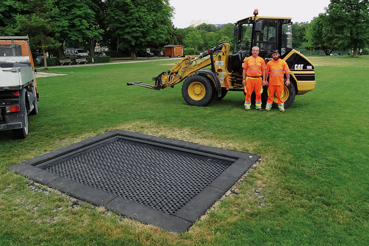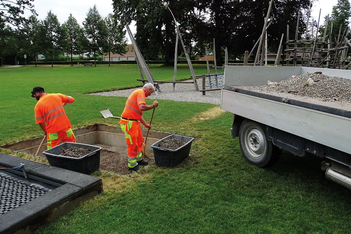 Les deux collaborateurs du Département d’aménagement urbain Rheinfelden, Stefan Maurer et Remo Hofmann, sont déjà sur place tôt le matin. A cette heure-ci, il n’y a encore personne sur l’aire de jeux, ce qui est voulu. Selon Maurer, les chargeuses sur pneus et leurs travaux sont toujours une attraction pour le public et sont particulièrement admirés par les enfants. Toutefois, pour des raisons de sécurité, cela pourrait devenir problématique lorsque des enfants s’approcheraient trop près de l’événement.