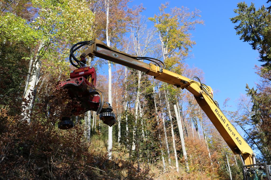 La pelle mobile M320F Cat, dotée d’un bras télescopique pouvant être rallongée jusqu’à deux mètres et de la tête de processeur ultramoderne à haut rendement Woody H61 de Konrad, est l’acquisition de machine la plus récente. Celle-ci est reliée à un logiciel de commande permettant de mettre en mémoire les exigences spécifiques du client, comme la longueur du bois. L’écran dans la cabine indique automatiquement le volume de bois du tronc d’arbre en cours de traitement. «Un soutien extrêmement utile», précise le machiniste de Riebli Forst AG, Marco Wicki. Tout comme le bras télescopique: «Dans les régions de montagnes, où l’on ne peut pas manœuvrer aussi facilement, nous apprécions énormément cette extension du rayon d’action.»