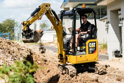 Une mini-pelle du type Cat 301.7 sert de modèle de base pour cette machine électrique. Ses dimensions, sa forme, son équipement, sa puissance et son poids en ordre de marche sont identiques à la machine originale équipée d’un moteur à combustion diesel.