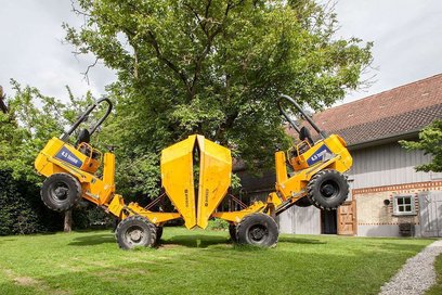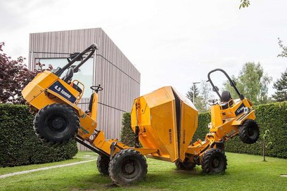 A partir de cette idée, trois artistes – qui se nomment CKÖ - «ont créé YUMIMEI», deux tombereaux sur pneus 4,5 t Thwaites avec la tête en bas et soudées aux bennes.