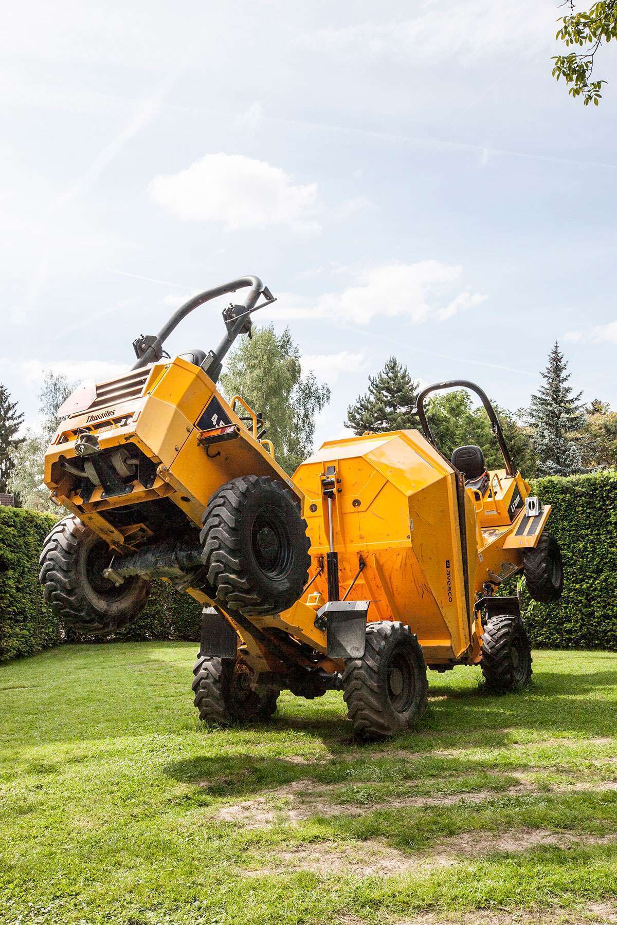 A partir de cette idée, trois artistes – qui se nomment CKÖ - «ont créé YUMIMEI», deux tombereaux sur pneus 4,5 t Thwaites avec la tête en bas et soudées aux bennes.