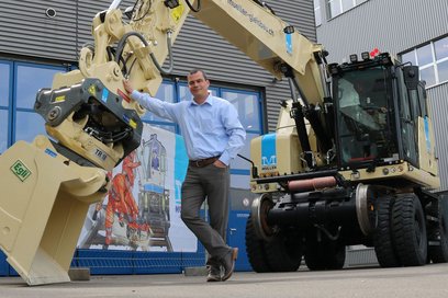 Una delle macchine più importanti nella costruzione binari è l’escavatore ferrovia. Nel parco macchine della Müller Gleisbau se ne contano sette!