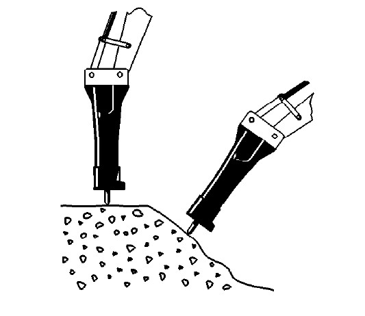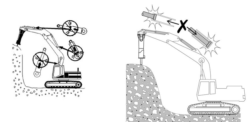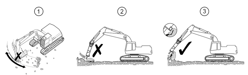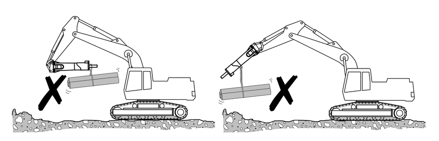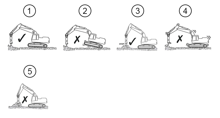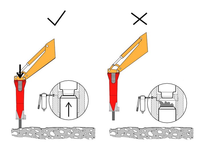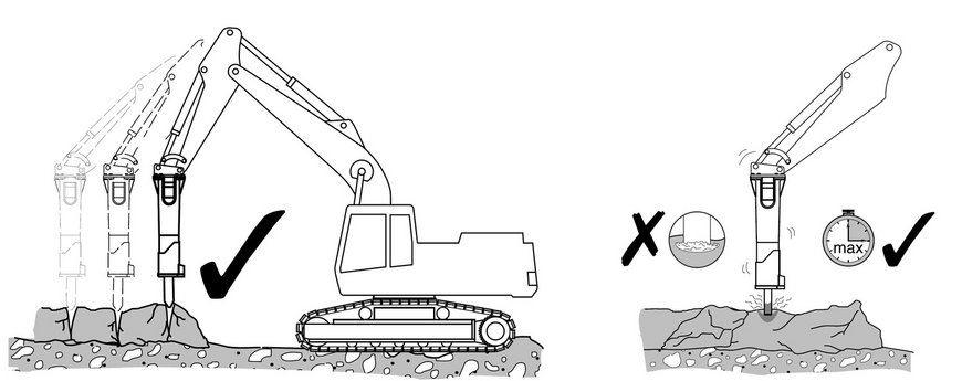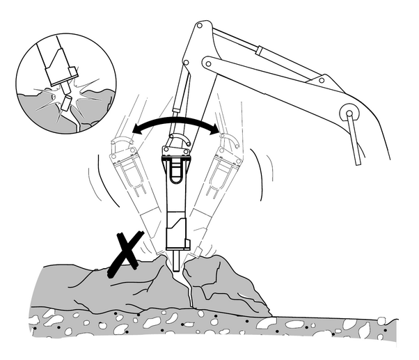 In generale, si dovrebbe usare il martello idraulico solo per rompere roccia, cemento e altri oggetti duri. Se si usa il martello per frantumare materiale troppo morbido, l'effetto sarà simile a quello dei colpi a vuoto. Frequenti colpi a vuoto possono portare a un aumento dell'usura e, di conseguenza, al danneggiamento del demolitore idraulico.