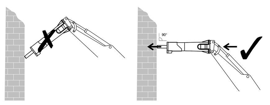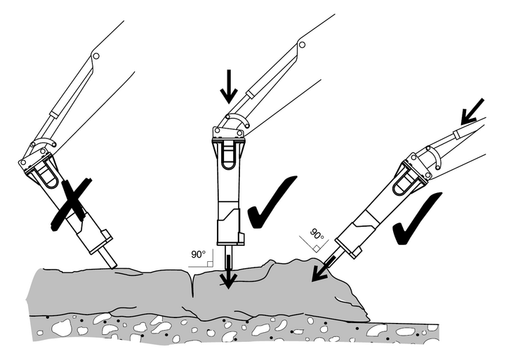 Se possibile, applicare il martello idraulico all'oggetto con un angolo di lavoro di 90°. In questo modo il martello esercita la forza d'urto ottimale sul materiale da lavorare e riduce al minimo l'usura dello scalpello e del manicotto inferiore dello scalpello.