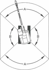 Quando si utilizza il demolitore idraulico, è molto importante che il supporto sia stabile. Quando si utilizza il demolitore, il montante deve essere posizionato nell'area (A). Non si deve lavorare lateralmente (area (B)), cioè quando il montante è posizionato ad angolo retto rispetto al sottocarro, perché ciò può ridurre la stabilità. Inoltre, il sottocarro viene caricato eccessivamente.