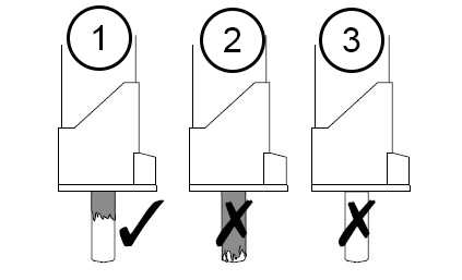 L'albero dello scalpello deve essere ben lubrificato durante il funzionamento. La quantità corretta di grasso è indicata nella Figura 1 (area grigia). Se la lubrificazione è insufficiente (Figure 2 e 3), interrompere il lavoro per rimuovere la lubrificazione eccessiva (Figura 2) o reingrassare (Figura 3). Controllare regolarmente durante il lavoro che l'albero sia lubrificato a sufficienza. Il "collare" deve essere sempre lubrificato (come nella Fig. 1), ma non l'intero gambo dello scalpello.