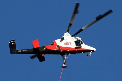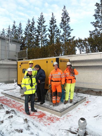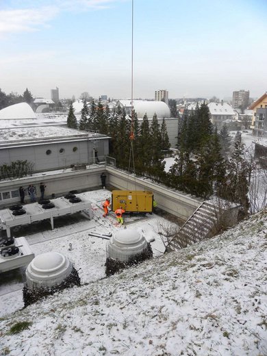 Aus Logistikgründen wählte Avesco AG für die Montage des Notstromaggregates die Flugvariante mit Helikopter da die Distanz für eine Pneukran-Montage sehr gross war und etliche Unsicherheiten punkto Aufstellmöglichkeiten bestanden. Die Entscheidung erwies sich dann in der Folge auch als richtig, denn innerhalb von 3 Minuten wurde das Aggregat durch den Helikopter präzise auf das Fundament abgesetzt. Die Installationen und Anschlüsse an das Notstromaggregat waren schnell erstellt, denn Avesco AG installierte die Notstromsteuerung mit Generatorschalter direkt in die Schalldämmhaube.