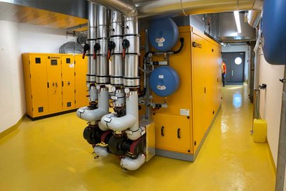- Leitungen mit nicht mehr benötigten Schiebern oder Muffen wurden durch neue Rohre ersetzt. So wurde zusätzlicher Platz geschaffen. Das erlaubte die Platzierung des BHKW an zentraler Position mitten im Raum mit optimalem Zugang von allen Seiten.