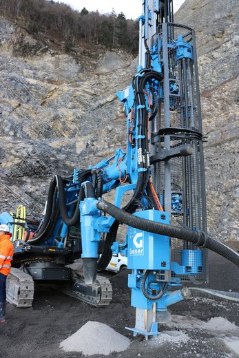 Der in Villeneuve genutzte DX800i ist in Ausführungen mit 21 und 25 kW Bohrhammerleistung lieferbar (DX900i: 27 kW). Die wichtigste und für den Einsatz in Schweizer Steinbrüchen interessanteste Neuerung betrifft die Bohrausrüstung. Die Maschine ist in der Lage, das Sandvik Bohrgestänge GT60 aufzunehmen und zu betreiben. Mit dieser Ausrüstung kann das Gerät dort bohren, wo bis anhin nur Imlochbohrgeräte zum Einsatz kamen. Das 60 mm Gestänge besticht durch die hohe Bohrgenauigkeit (Steifigkeit) und optimale Spülresultate, da der kleinere Ringraum zwischen Krone und Gestänge für ausreichende Spülgeschwindigkeit sorgt.